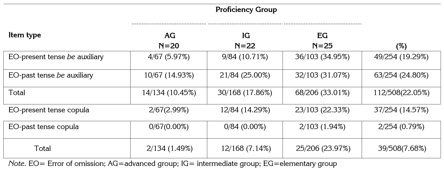 Results indicate that the past tense be auxiliary verb forms had a higher rate of morpheme omission (24.80%) than the present tense forms across all three groups, with the elementary group having the highest percentage of omission. However, paired two-sample .-tests reported that the difference in the omission levels of past and present tense be auxiliary items was not significant (.>.05) for the advanced group (.(19)= -2.875, .= .164) and across all groups collectively (.(66)= -2.109, .= .255). With respect to the copula verb forms, omission of morphemes was found only with the present tense forms (14.57%) and no omission was observed with the past tense copula verb forms (0%) except for the elementary group where only two instances of omission were identified (0.79%). T-test analysis exposed that the difference in the omission levels of copula be items was extremely significant (.<.05) throughout all groups (.(66)=2.732, .= .001) with only two instances of the past tense copula be forms being omitted. In general, statistics show that the three proficiency groups produced more EO of be forms for the be auxiliary (22.05%) than for the copula verb forms (7.68%). Regarding the ungrammatical EO of be auxiliary verbs (.(2,64) = 3.351, .= .174) and that of the copula verb forms (.(2,64) = 1.876, .= .143), a one-way ANOVA and post-hoc Scheffe tests revealed no statistically significant differences (.>.05) among the three groups.