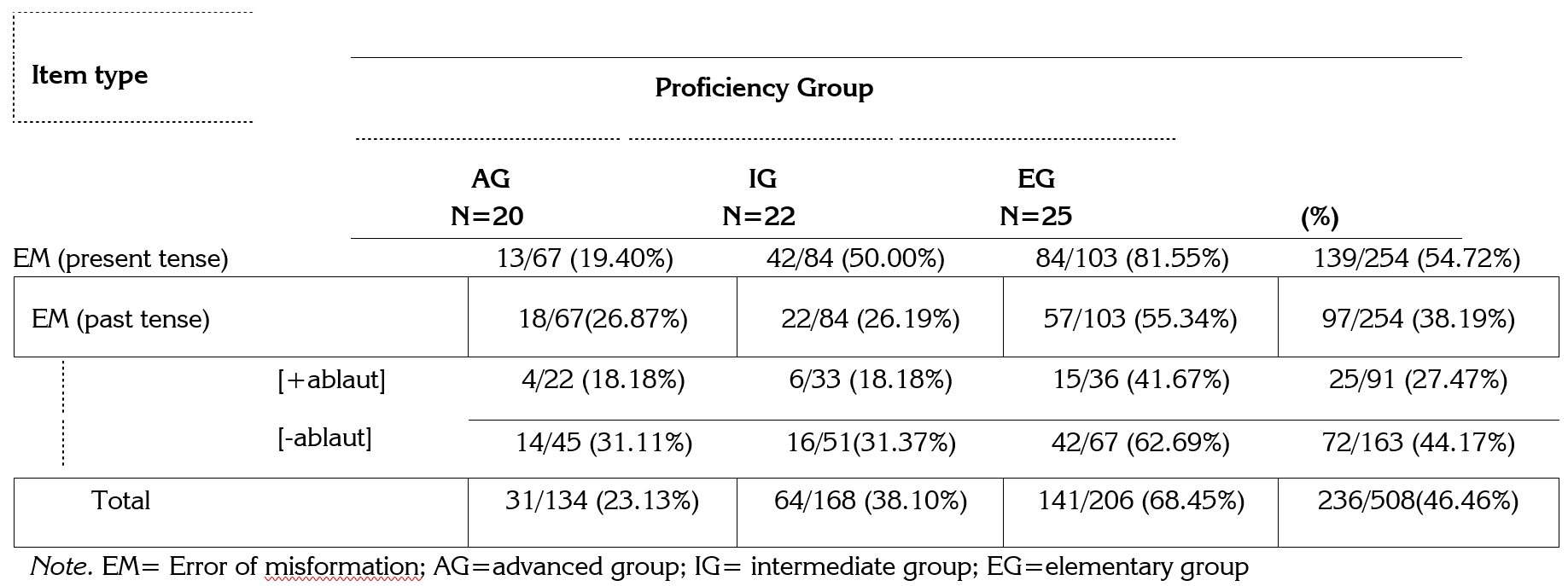 The ungrammatical EM occurs when learners use the incorrect format of the present and past verbal inflectional morphemes in obligatory contexts.