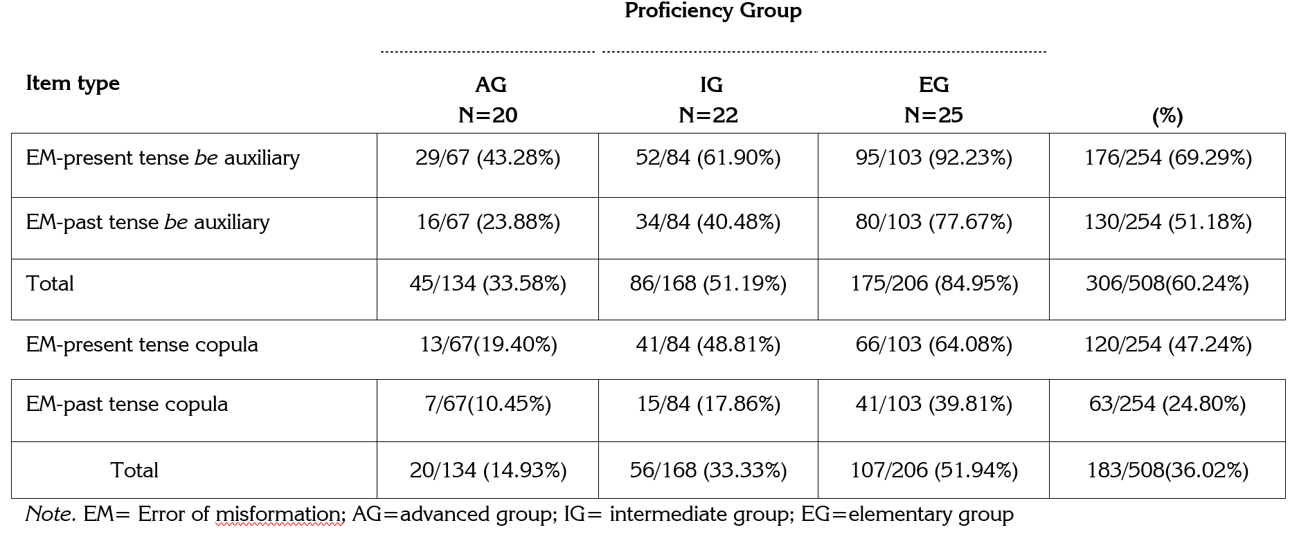 In general, the outcomes revealed that Arab EFL undergraduate learners, particularly advanced learners at the highest level of attainment, had little trouble using the past and present tense inflectional morphemes correctly. Their accuracy scores for ungrammatical omission and erroneous usage of present and past tense items were lower than those for be auxiliary and copula items. For adult Arab EFL learners who did not attain native or near native-like competency in these items, the correct use of be auxiliary and copula items appears to be problematic. These findings will be useful in guiding future research.