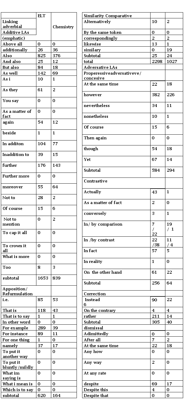 The “adversative” LAs were more frequent in ELT RAs than in Chemistry RAs. This coincides with Liu’ (2008) observations. The usage of this LA in Chemistry RAs could suggest that chemistry writers prefer to avoid the adversative LAs, as they function as a marker of “compatibility between information in different discourse unit and signal concessive relationships” (Biber et al., 1999: 878). This function creates a text with more clear connections between units of information, resulting in a to easyto-follow text.