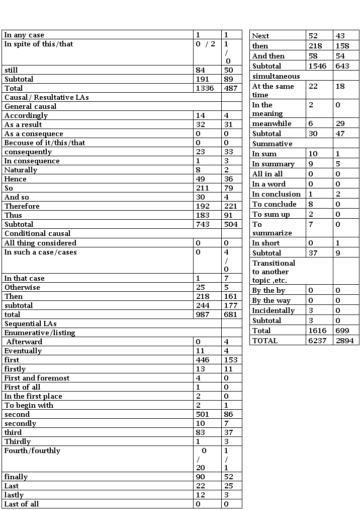 To start with, Liu (2008) investigated the frequency and usage of English LAs across five registers namely spoken English, academic writing, fiction, news writing, and other writings extracted from British National Corpus (BNC). This study is considered a major and leading contribution to scholarship on LAs, as Liu consulted major English grammar books to produce a comprehensive list of 110 items based on the investigation of BNC for the realizations of the LAs. To identify the LAs, Liu adopted the framework suggested by Celce-Murcia and Larsen-Freeman (1999), which is clear, simple, and comprehensive, and simultaneously correlated with Halliday and Hassan’s (1974) original fourway clarification system. Liu’s model includes four categories: additive, adversative, causal, and sequential. She found that speaking and academic writing registers used LAs differently in the five registers analyzed in her study. Indeed, she noted that some LAs in each category had received different attention and concluded that LAs should be included in students’ instructions, considering their specific learning needs and concrete curriculum’s objectives.