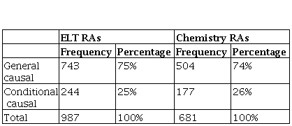 The usage of the causal/resultative LAs in both disciplines was very similar. The result is comparable to those in studies carried out by Lei (2012), Gao (2016), and Liu (2008). The findings can be explained if we consider that a causal/resultative structure is not required in all the four sections of RA. In general, readers expect to have causal /resultative structures in the sections where a RA presents results and discussions.