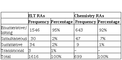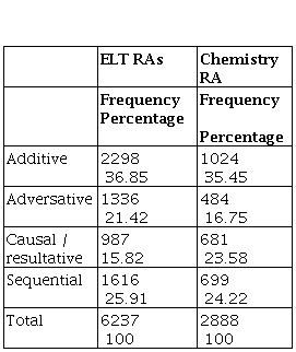 Next in the list is the “sequential” LAs based on its frequency of usage. The difference concerning the use of this category indicates that ELT writers treat their studies as narratives that require presenting sequences of events (Liu, 2008). It seems that in hard science disciplines, Chemistry in this case, writers do not prefer to introduce parallels and the sequential information, which in turn could favor the cohesiveness of those articles.