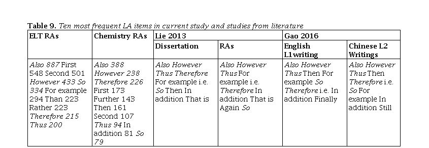 The results in Table 9 suggest that “also” was the most frequent additive LA in both sets of RAs. The frequency of the differences between the two sets of RAs was statically significant suggesting that ELT RA writers favor adding info and make component sentences using “also” to directly show this function. (Example 21-22).