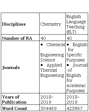 The corpus of this study consisted of 40 RAs from the discipline of Chemistry and an additional 40 research articles from the discipline of ELT. To compile the corpus, the researchers selected two disciplines (ELT and Chemistry) to represent the classification of hard and soft science disciplines. Thus, the findings of this study could have a noticeable contribution to writers in these two disciplines. After selecting the disciplines, two journals from each field were chosen, following experts’ recommendations. For Chemistry, the journals Chemical Engineering Science and Applied Thermal Engineering were selected, considering the insights provided by some faculty members from the Department of Chemistry. For applied language studies, the researchers of this study selected two journals, considering their own academic background in ELT: English for Specific Purposes and the Journal of English for Academic Purpose. Next, the researchers selected research articles published in the period 2018-2019. Table 1 breaks down the corpus selection.