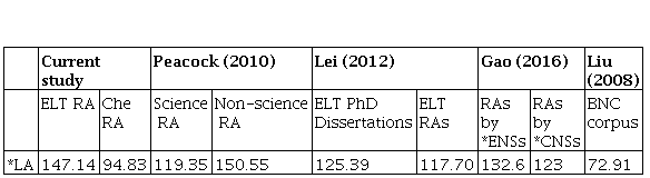 They prefer to deal with their research justification, methods, procedures, results, and discussion as narrative and descriptive discourse. Moreover, they show a preference for describing these sections step by step and one by one and expect readers to work out their claims. A closer look at Table 2 displays the differences concerning the frequencies of LAs between the findings of this study and Gao (2016), Lei (2012), Liu (2008), and Peacock (2010). The difference could be justified as in this study RAs were analyzed while in Liu (2008) a variety of written academic texts were analyzed.