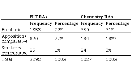 Third, as the two sets of RAs were not equal in size (ELT, 423867 words and Chemistry, 304469 words), the frequencies of LAs were normalized per 10000 words. This makes the comparison between the two sets of RAs, as well as with the findings reported in the literature, to be more meaningful and possible. Fourth, the frequency and functional differences of LAs between the two sets of RAs were presented, compared with the findings presented in the literature, and discussed to reach final concluding remarks.
