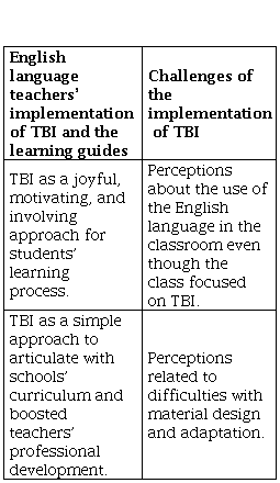 Moreover, the findings show that the use of TBI learning guides gave teachers the ease to articulate their content with the different curricula proposed in public schools. Furthermore, the implementation of the TBI approach was perceived overall to be useful for the adoption and adaptation of the Colombian Ministry of Education (MEN) guidelines for teaching English. As presented in the English Suggested Curriculum proposed by MEN (2016), TBI is one of the approaches that facilitates the development of communicative competence.