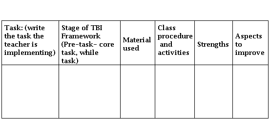 The second instrument was classroom observations, which Marshall and Rossman (1989), cited in Kawulich (2005), define as “the systematic description of events, behaviors, and artifacts in the social setting chosen for study” (p. 2). The observations were conducted by the academic team of the project which provided an external view of the English language teachers’ perceptions as they were not part of the research team. The academic team was composed by English language teaching professionals hired by the Gobernación de Risaralda to receive training in supporting the participant teachers in the implementation of the project. To conduct the observations, the team used a pre-established observation format (see Appendix B) that included the description of the task, the development of the task (pre-task, whiletask, and post-task stages), class procedure, material used, and general comments regarding the implementation of TBI.