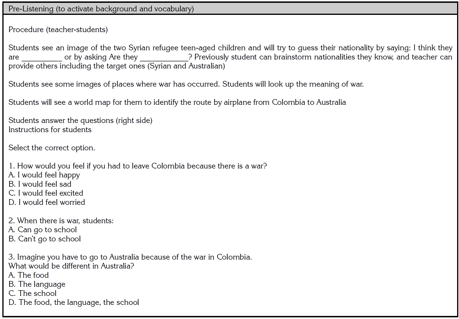 In this example, it can be noted that the prelistening phase of this lesson focuses on meaning mostly by tapping into teen-aged learners’ background knowledge about nationalities and feelings. Support to activate or build background knowledge is provided by showing a world map where students can see the route from Colombia to Australia. Likewise, the use of images provides comprehensible input and spark students’ interest in knowing about students from another place in the world. Additionally, teachers can provide a challenge by asking learners to express their emotions about leaving their country, with the help of multiple-choice options that serve as linguistic support.