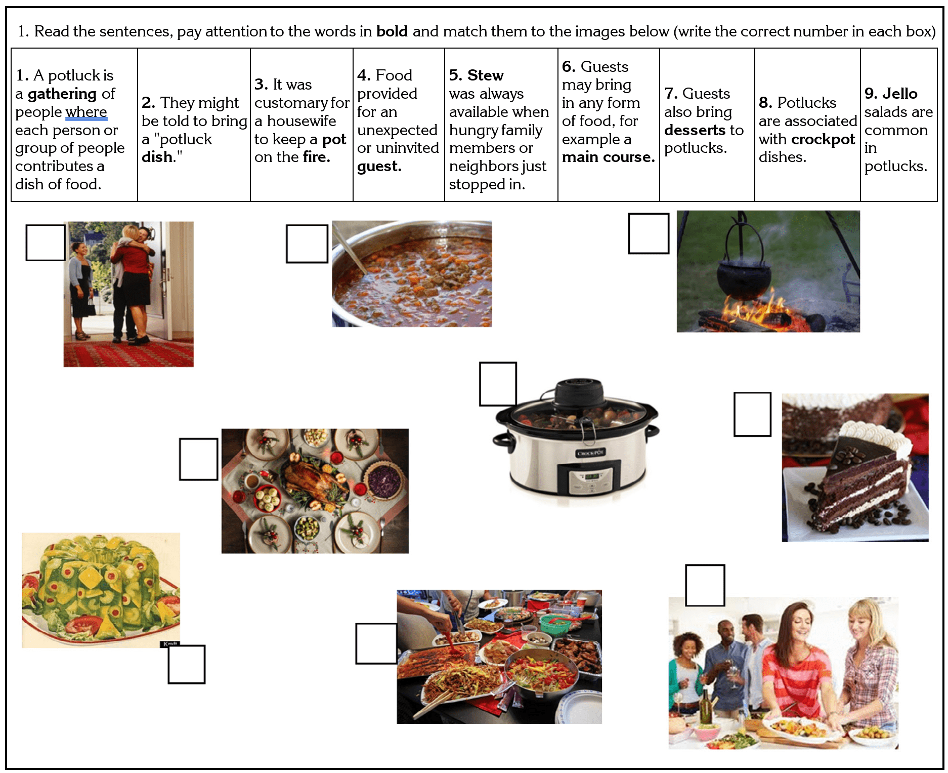 In this pre-reading task, learners are challenged to read fragments taken from the actual reading material, identify the target vocabulary words in context, and find the matching image. This task encourages learners to engage in close reading, observation, analysis, and other activities that are likely to promote retention. However, since potlucks are a very usual practice within United States communities and culture that many Colombian learners may be unfamiliar with, the teacher’s first job is to provide support (build background) before asking students to focus on vocabulary, even when it is presented in context. One way to do it is by showing some images of potlucks and elicit ideas about the event, such as people, food, sharing, etc., or surfing the web to find its meaning and related images.