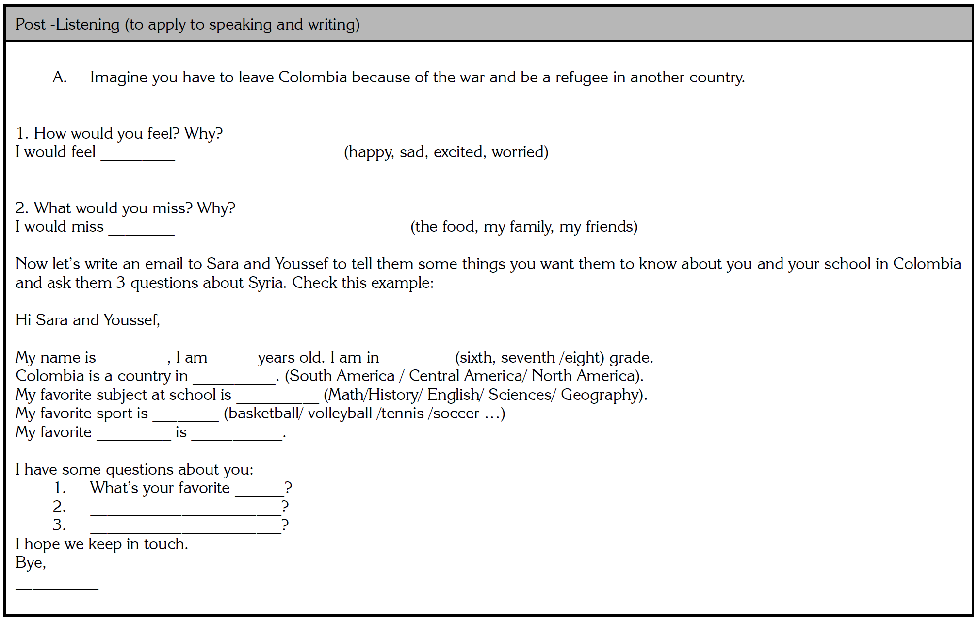 Laufer and Hulstijn (2001) suggest that three factors, need, search and evaluation, are necessary to help retention of new language. In the post-stage, teachers need to move beyond having students answer comprehension or reflection questions, they need to create tasks that demand high involvement. For example, by encouraging the creation of new products or projects that include making brochures, writing stories, doing surveys, making videos or other real-life tasks and artifacts, learners are encouraged to integrate and use new language items. During this process, “learners are required to go back to the language worked on at the pre- and while-stages (i.e., need); find the language they need including aspects such as pronunciation, meaning, part of speech, grammar, etc. (i.e., search); and analyze (i.e., evaluation) how to integrate it within the given products” (Alfonso-Vargas & Romero-Molina, 2019, p. 32). However, these activities must not only stretch the linguistic abilities of the students but create meaningful connections to their own culture/context. Table 4 presents a proposal for a post-listening stage activity on the same material about Syrian children refugees.