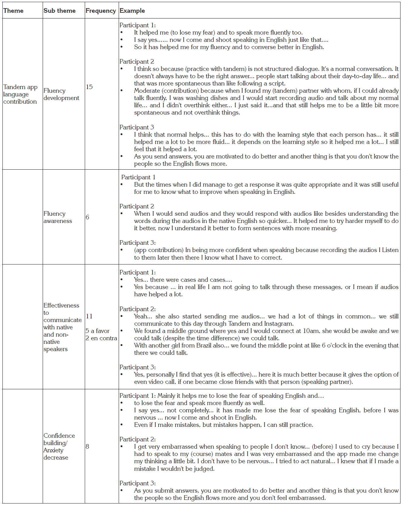 Learners’ perceptions, extracted from the semi-structured interviews, were examined using a thematic analysis. From the overarching theme concerning the Tandem app’s contribution, five major sub-themes emerged: speaking fluency development, speaking fluency awareness, interaction with native and non-native speakers, and the creation of a safe learning environment. These sub-themes are exemplified by excerpts from the participants’ comments in Table 3: