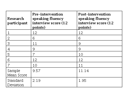 Taking into consideration the mean scores displayed in Table 1, it is possible to state that, as a group, there was a slight improvement of 1.57 points (13.08%) in the learners’ overall fluency level. In fact, 5 out of 7 (71%) participants scored over 9 points in the pre-speaking fluency interview, and this figure increased to 6 out of 7 (86%) participants during the post-intervention speaking fluency interview. Additionally, given the high mean scores obtained, it can be inferred that students’ initial speaking fluency, particularly concerning speech rate and use of pauses, was notably proficient. Nevertheless, minor improvements of 3 points (25%) and 1 point (8.34%) were observed in Participants 5 and 7 respectively, as suggested by the results from the post-intervention speaking fluency interview. Accordingly, participants’ high mean scores during pre- and post-intervention speaking fluency interviews were consistent with the standard deviation calculated, as shown in Table 1.