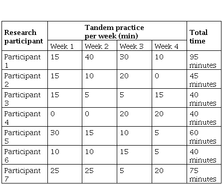 Participants could also send voice messages related to practiced communicative language functions such as self-introduction, describing appearance and personality, and discussing routines. The intervention design included pre-activities such as vocabulary review and video analysis, as a strategy to make sure participants focused on oral fluency when using the app. Additionally, learners were encouraged to use the Tandem app as frequently as possible after each intervention session. They were prompted to report orally during the subsequent session the amount of time they dedicated to practicing on the app.