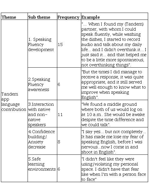 Learners’ perceptions, extracted from the semi-structured interviews, were examined using a thematic analysis. From the overarching theme concerning the Tandem app’s contribution, five major sub-themes emerged: speaking fluency development, speaking fluency awareness, interaction with native and non-native speakers, and the creation of a safe learning environment. These sub-themes are exemplified by excerpts from the participants’ comments in Table 3: