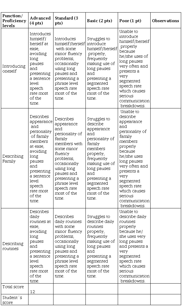 The main purpose of this report lies in the analysis of 14 rubrics to agree or disagree on the consistency of the results derived from interviews conducted by Professor Miguel Agurto with 7 students pre- and post-intervention, whose main objective was to measure oral communication skills in English, based on 3 functions: personal information, description of appearance and personality and daily routine based on two key elements of fluency: use of pauses and connection of the message at the sentence level. Additionally, the perceived usefulness for the students of the functions presented in the rubric, implications in the instructions and feedback are also analyzed. Furthermore, for the analysis I counted with the support of 14 recordings to the 7 students before and after the intervention of Professor Agurto.