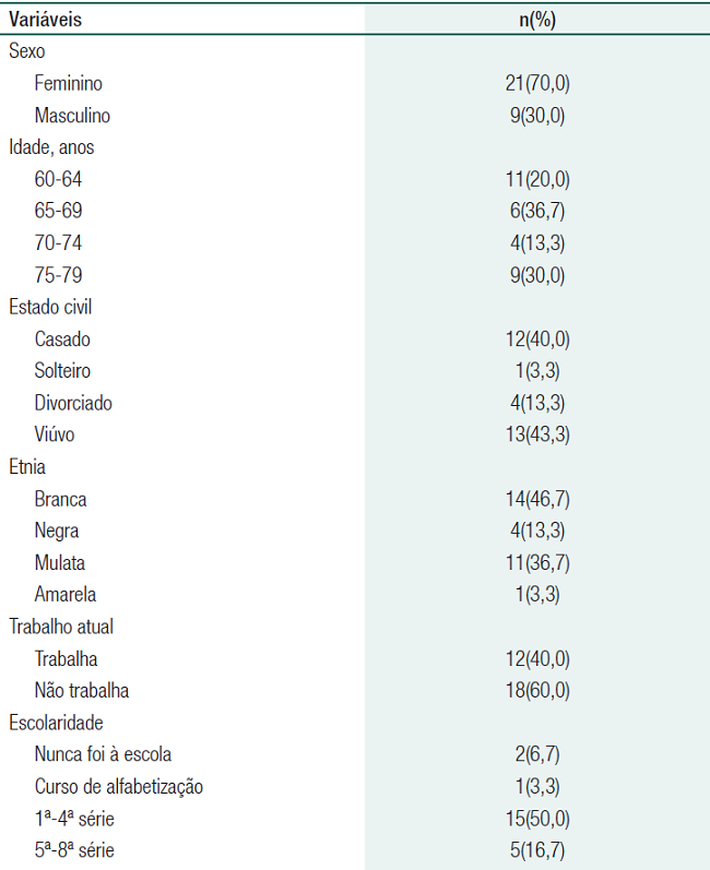 A amostra deste estudo foi constituída por 30 idosos entrevistados em diferentes locais em 2013, sendo 70% do sexo feminino. A faixa etária predominante foi de 60 a 64 anos (36,7%), com média de 68,77±6,92 anos. A tabela 1 apresenta uma descrição das variáveis independentes.