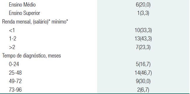 Os viúvos foram os predominantes (43,3%). Houve maior percentagem de pessoas da etnia branca (46,7%); dos que não trabalhavam (60%); dos que concluíram da 1ª a 4ª série (50%); e dos que apresentavam renda entre um e dois salários mínimos (43,3%). Diante dos resultados obtidos relacionados ao tempo de diagnóstico de diabetes mellitus tipo 2, a maior percentagem foi dos idosos, com tempo entre 25 e 48 meses (46,7%), apresentando variação de 12 e 96 meses, com média de 48,33±19,72 meses.