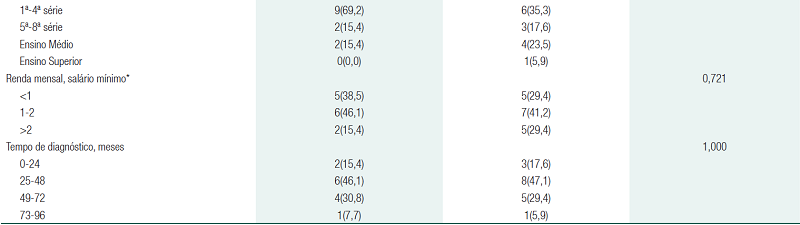 No que diz respeito aos idosos que trabalhavam, foram evidenciados maiores escores entre os que não trabalham no Grupo 1 (69,2%) comparativamente ao Grupo 2 (52,9%), não havendo diferenças estatísticas significativas. Já o grau de escolaridade foi prevalente entre os que concluíram o ensino da 1ª a 4ª série no Grupo 2 (35,3%), da mesma forma que nos idosos do Grupo 1 (69,2%). Entre a renda mensal e a síndrome da fragilidade, houve grandes porcentagens em ambos os grupos: aqueles que apresentavam renda entre um a dois salários mínimos no Grupo 1 (46,1%) e no Grupo 2 (41,2%), sem diferenças significativas. Em relação ao tempo de diagnóstico de diabetes mellitus tipo 2, foi predominante a fragilidade entre os idosos que apresentaram tempo de diagnóstico entre 25 a 48 meses (47,1%) comparativamente aos demais tempos.