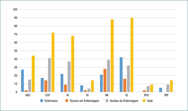 Conforme demonstrado na tabela 1, constata-se quantitativo maior de ocorrências envolvendo Auxiliares (46,1%). Desse modo, esse dado nos revela a necessidade de se revisitar estudos, como os realizados por Peduzzi e Anselmi(9) no tocante às atividades que na prática estes profissionais desenvolvem. Neste diapasão, Padilha et al(10) também alerta acerca da realização de atividades de maior complexidade por Auxiliares, embora muitas vezes despreparados para fazê-los.