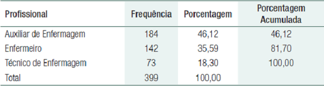 O profissional Enfermeiro figura em 35,59% das ocorrências, valendo destacar a mudança no perfil das atividades dos profissionais Enfermeiros a partir da implementação do Sistema Único de Saúde, bem como as transformações na prática de enfermagem com base no contexto histórico, político e social, expandindo o trabalho dos profissionais enfermeiros, principalmente no serviço público, gerando maior acúmulo de atribuições.(11) Ainda é sabido, que a ação gerencial do enfermeiro esta intimamente ligada a sua prática profissional, gerando assim muitas vezes a responsabilização pelas atividades executadas pelos Técnicos e Auxiliares de Enfermagem, uma vez que voltada a implementação da assistência de enfermagem, “norteada pela compreensão e pelo conhecimento do paciente como pessoa, e de suas necessidades específicas.”(12)