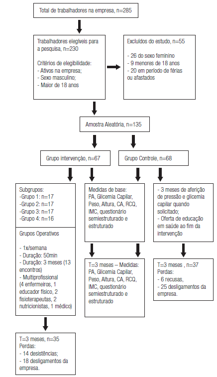 Na Fase II, foi realizada amostragem aleatória de 135 participantes entre os 230 trabalhadores da metalúrgica. Essa amostra foi randomizada para os grupos intervenção e controle, por meio de sorteio simples, sendo 67 alocados no grupo intervenção e 68 no grupo controle. Os trabalhadores do grupo intervenção foram convidados a participar de um programa de educação em saúde, e após aceitarem participar, foram subdivididos, também por sorteio simples, em quatro subgrupos, de modo que o número reduzido de participantes em cada grupo garantisse a visualização de todos os indivíduos ao mesmo tempo durante as atividades.(12)