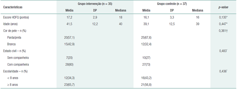 No geral, a média de idade dos participantes do estudo foi de 40,3 anos (desvio padrão ±12,3). A maioria tinha cor DA pele parda/preta (62,5%), vivia com companheira (76,4%) e tinha oito anos ou mais de estudo (61,1%). A média de conhecimento sobre fatores de risco para doenças cardiovasculares foi de 16,6 pontos (dados não apresentados). Essas características, segundo o grupo de alocação dos participantes, são apresentadas na tabela 1. Observa-se que não houve diferenças estatisticamente significativas entre os grupos, garantindo a comparabilidade dos mesmos.
