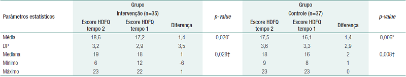 Na tabela 2, são apresentadas as comparações entre o nível de conhecimento sobre fatores de risco para doenças cardiovasculares dos participantes segundo grupo de alocação, antes (tempo 1) e após (tempo 2) a intervenção. Observa-se que, em ambos os grupos, houve um aumento estatisticamente significativo (p<0,05) de 1,4 ponto na média do escore de HDFQ no tempo 2. Resultado semelhante foi verificado para a mediana, que aumentou significativamente tanto no grupo intervenção (p=0,028) quanto no grupo controle (p=0,008).