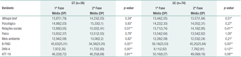 Na segunda fase do estudo, no GT, o Whoqol-bref total e o domínio Psicológico apresentaram correlações negativas, moderadas (r>0,30) e estatisticamente significativa (p<0,05) com B-PAID e ATT-19. O domínio Físico e o Meio Ambiente apresentaram correlações negativas e moderadas com o B-PAID. O B-PAID apresentou correlação negativa, moderada com o DKN-A (r=-0,33, p=0,05) e positiva e forte com o ATT-19 (r=0,56, p<0,05). No GC foi observada correlação negativa e moderada entre o domínio Psicológico do Whoqol-bref e o ATT-19 (r= -0,30, p=0,00) (Tabela 3).