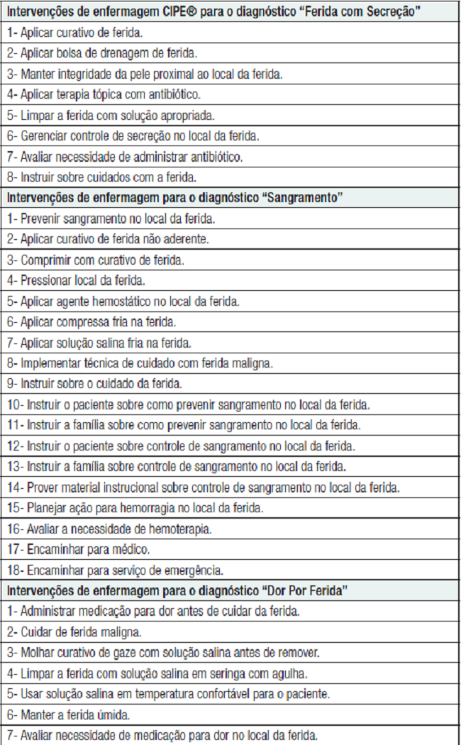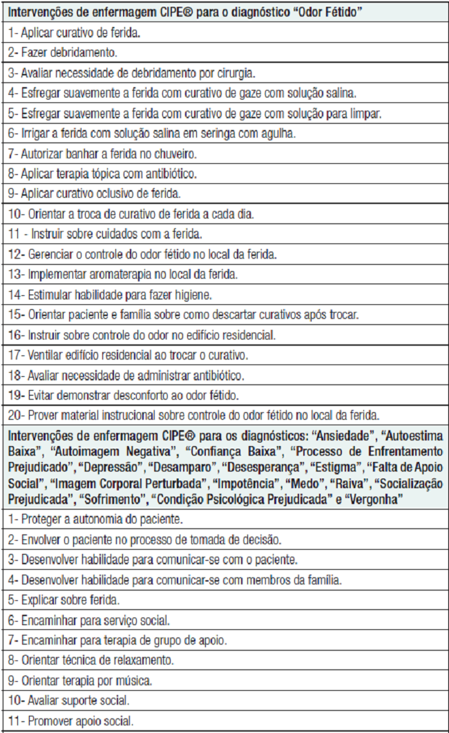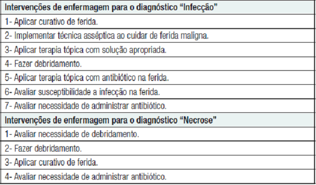 Nos textos consultados, as evidências empíricas mais citadas foram: odor (100%), exsudato (90%), impacto psicossocial (93%), sangramento (83%), dor (76%), infecção (74%) e necrose (62%). Foram construídas intervenções de enfermagem a partir dos diagnósticos de enfermagem baseados nas evidências empíricas mais citadas.
