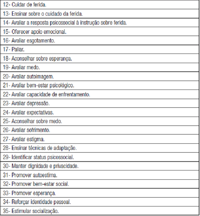 Das intervenções de enfermagem indicadas para as evidências empíricas mais citadas nos textos, foram elaboradas 134 intervenções de enfermagem, sendo que destas, 122 foram validadas pelos peritos (91,04%), sendo apresentadas no quadro 2.