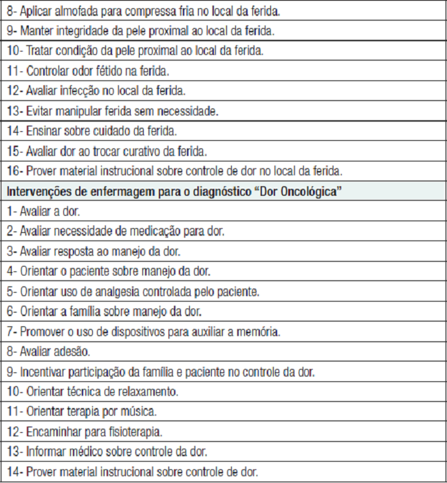 Na etapa do plano assistencial, as intervenções de enfermagem indicadas para cada diagnóstico já construído, foram agrupadas em um quadro, de acordo com seu objetivo no cuidado à ferida tumoral maligna e, posteriormente, foi realizado o mapeamento cruzado com os termos da CIPE®, sendo desta forma elaboradas 134 intervenções de enfermagem.