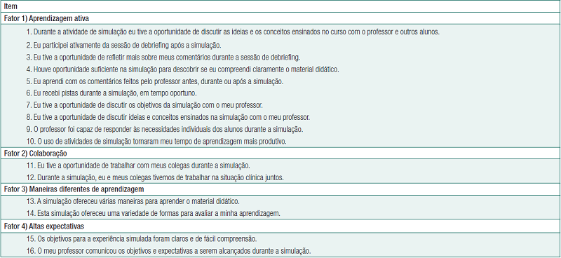 Com propósito de compreender como as práticas educativas são percebidas pelos indivíduos que participam da estratégia de simulação de alta fidelidade, a National League for Nursing (NLN) - organização dedicada a excelência no ensino de enfermagem - desenvolveu a Educational Practices Questionnaire (Student Version), instrumento composto por 16 itens, com duas subescalas (uma relacionada às praticas educativas e outra à importância atribuída ao item). O instrumento é dividido em quatro fatores: 1) Aprendizagem ativa, 2) Colaboração, 3) Maneiras diferentes de aprendizagem e 4) Altas expectativas. O padrão de resposta é do tipo Likert de 5 pontos, havendo a opção de “não aplicável” quando a declaração não diz respeito à atividade simulada realizada. O estudo de validação do mencionado instrumento foi realizado com 395 estudantes, sendo 350 mulheres e 45 homens com a média de idade de 29 anos. A confiabilidade constatada através do alpha de Cronbach foi de 0,86 para a escala de características das práticas educacionais e 0,91 para a importância dos itens.(9)