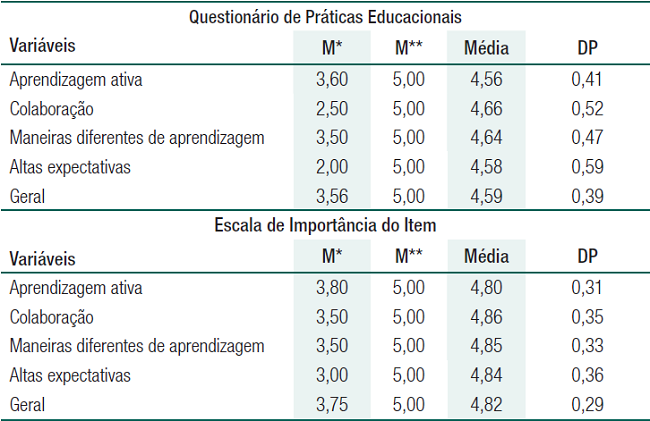 A tabela 1 traz valores estatísticos descritivos relativos ao Questionário de Práticas Educativas e a Escala de Importância do Item.