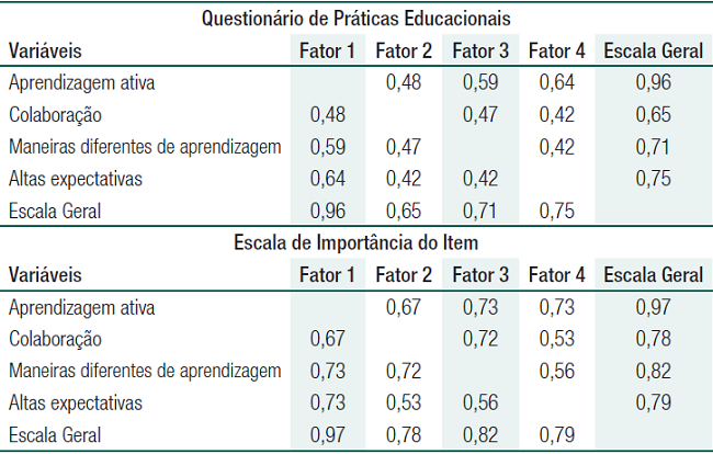 A consistência interna foi verificada através do alpha de Cronbach e está descrita os seguintes valores: aprendizagem ativa 0,86, colaboração 0,87, maneiras diferentes de aprendizagem 0,77, altas expectativas 0,70 e para escala geral 0,90.