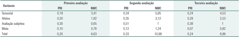 A tabela 3 apresenta o Pain Rating Index e Number of Words Chosen, em médias, na primeira, segunda e terceira avaliações. Vale ressaltar que valores de Pain Rating Index mais próximos de 1 corresponderam a maiores níveis de dor.