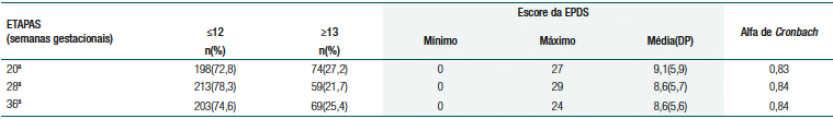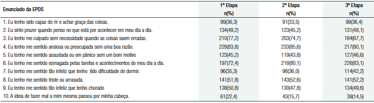 A confiabilidade da EPDS foi verificada pelo coeficiente Alfa de Cronbach. Para comparar os resultados da EPDS ao longo das três etapas foi utilizado o teste de Friedman.