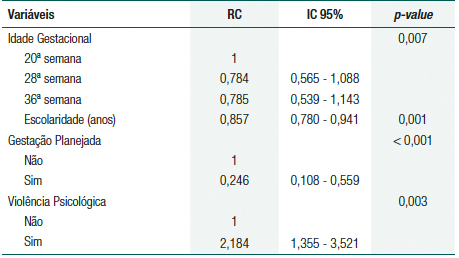 As variáveis independentes foram: idade em anos completos, anos de estudo, etnia autodefinida (branca, preto/pardo, amarela), situação conjugal (com e sem parceiro), religião (católica, evangélica, outro, sem religião), trabalho remunerado (não, sim), renda familiar em salário mínimo de 2009 (≤R$465,00; R$466,00 ├ R$931,00; R$932,00├ R$ 1.397,00; ≥R$1.398,00), número de gestações incluindo a atual (um, dois, três ou mais), número de partos (nenhum, um, dois, três ou mais), número de filhos vivos (nenhum, um, dois, três ou mais), número de filhos que vivem com a gestante (nenhum, um, dois, três ou mais), número de queixas gestacionais como náusea, vômito, queimação, dor lombar citada (nenhuma, uma, duas, três ou mais), sofrer ou ter sofrido violência física como tapas, empurrões ou psicológica como ameaças de abandono, gritos, antes ou durante a gravidez (não, sim) e quem foi o agressor (parceiro, familiares, outros), planejamento da gravidez (não, sim), aceitação da gravidez (não, sim, em processo de aceitação), uso de tabaco (não, sim), uso de álcool (não, sim), uso de outras drogas (não, sim), problema mental prévio ou atual (não, sim) e problema mental na família (não, sim).