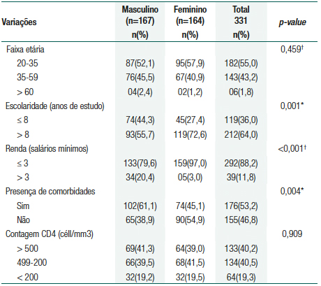 Participaram do estudo 331 pessoas vivendo com o HIV/Aids, sendo 167 (50,4%) do sexo masculino e 164 (49,5%) do sexo feminino, com idade variando entre 20 e 71 anos, com média de 40 anos.