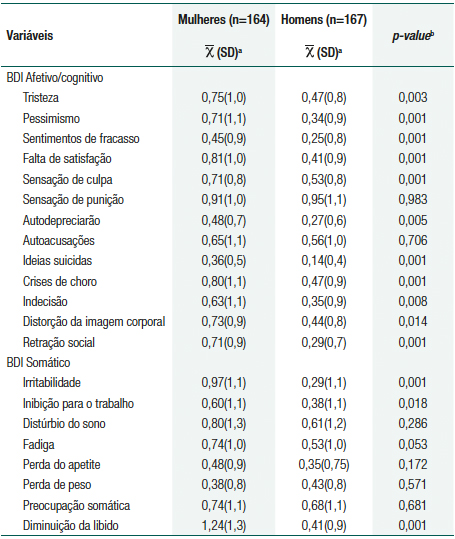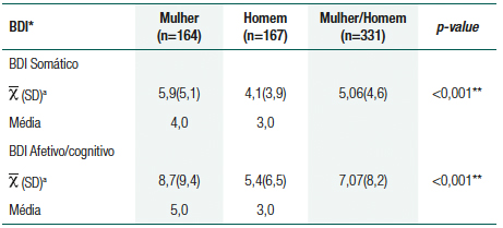 Na tabela 3, verificou-se que as mulheres apresentam maiores escores com diferença estatística em 14 itens do BDI quando comparados aos homens.