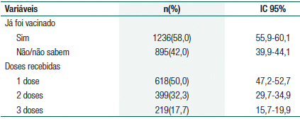 Com relação à situação vacinal, 58,0% dos internos referiram ter recebido alguma dose da vacina e 42,0% ou não receberam ou não sabiam informar. Somente 17,7% afirmaram ter recebido o esquema completo (Tabela 1).