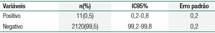 Do total de internos 11 (0,5%) foram reagentes na pesquisa por antígenos específicos para Hepatite B (Tabela 2).