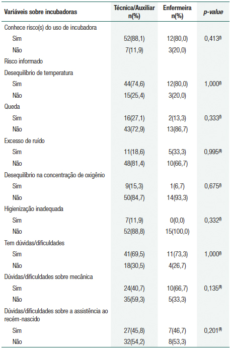 Ainda por esse questionário, foram utilizadas as seguintes variáveis para avaliação dos conhecimentos entre os profissionais: conhece benefício(s) do uso da incubadora (sim, não), benefício(s) do uso da incubadora, conhece risco(s) do uso da incubadora (sim, não), risco(s) do uso da incubadora, tem dúvida(s)/dificuldade(s) no manuseio das incubadoras (sim, não), dúvida(s)/dificuldade(s) sentida(s). As dúvida(s)/dificuldade(s) relatadas foram relacionadas às áreas mecânica (sim, não) e aos cuidados com o recém-nascido (sim, não).