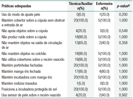 Durante as observações, foi utilizado instrumento tipo checklist elaborado especificamente para este estudo e teve como base as recomendações do Ministério da Saúde(4)e do fabricante das incubadoras neonatais (9) utilizadas na unidade. Foi composto por 13 práticas para as quais foi assinalado sim (prática adequada) ou não (prática inadequada): uso de modo de ajuste pele, mantém cobertor sobre a cúpula sem obstruir a entrada de ar, não apoia objetos sobre a cúpula, não produz ruído sobre a cúpula, não mantém objetos na saída de circulação de ar, não mantém objetos no colchão, não utiliza cobertores sobre o recém-nascido, mantém as portinholas fechadas, mantém manga-íris fechada, mantém incubadora com manga-íris, mantém rodízios travados, mantém a incubadora protegida do sol e mantém o sensor de pele sobre o recém-nascido. No momento da observação, todas as incubadoras contavam com portinholas, travas nos rodízios e sensor de pele.