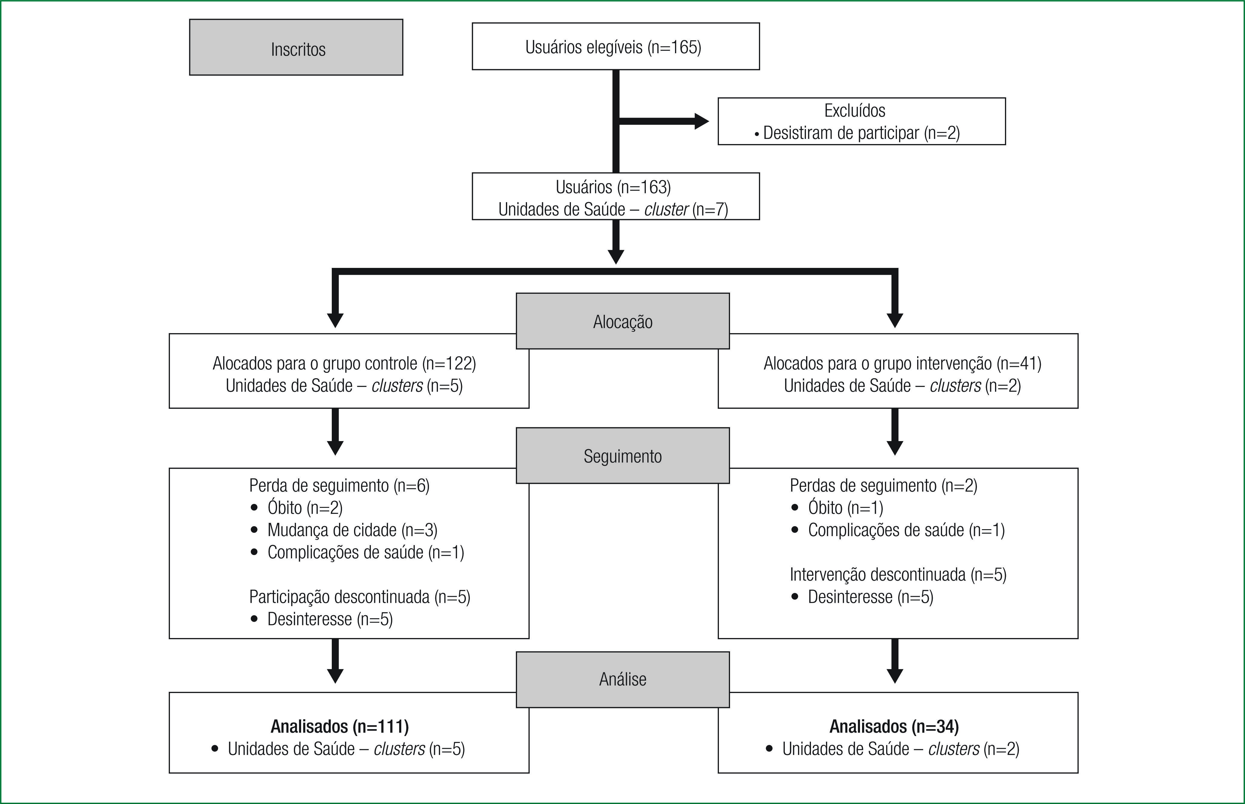 A amostra foi constituída por 163 usuários com diabetes tipo 2 e, após a distribuição das unidades de saúde, 41 usuários foram alocados ao grupo intervenção e 122 foram controle. No decorrer do estudo, houve perdas e, ao final, 145 usuários (34 do grupo intervenção e 111 do controle) tiveram seus dados analisados.