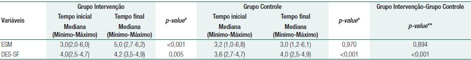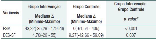 Por fim, quanto ao empoderamento, medido pela escala DES-SF, obteve-se um aumento estatisticamente significativo do escore mediano nos dois grupo (p<0,05; Tabela 2). No entanto, este aumento não foi considerado estatisticamente diferente entre os dois grupos (p=0,607; Tabela 3).