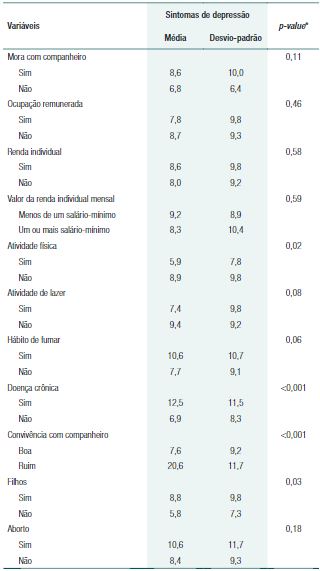 Além da convivência com companheiro, a variável número de filhos (p=0,01) foi preditor estatisticamente significativo do escore dos sintomas de depressão. Portanto, quanto maior o número de filhos, maior o escore dos sintomas de depressão.
