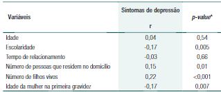 Na correlação, observou-se que quanto maior o número de pessoas que residem no domicílio (p=0,01), maior o número de filhos vivos (p<0,001), menor a escolaridade (p=0,005) e menor a idade da mulher na primeira gravidez (p=0,007), maior o escore dos sintomas de depressão (Tabela 2).