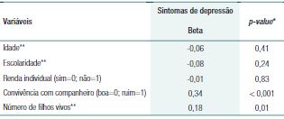 A tabela 3 apresenta os resultados da análise de regressão linear múltipla. As participantes que referiram convivência “ruim” com o companheiro tiveram maior escore dos sintomas de depressão (Beta=0,34; p<0,001), mesmo após o ajuste para as demais variáveis previamente reconhecidas na literatura científica.